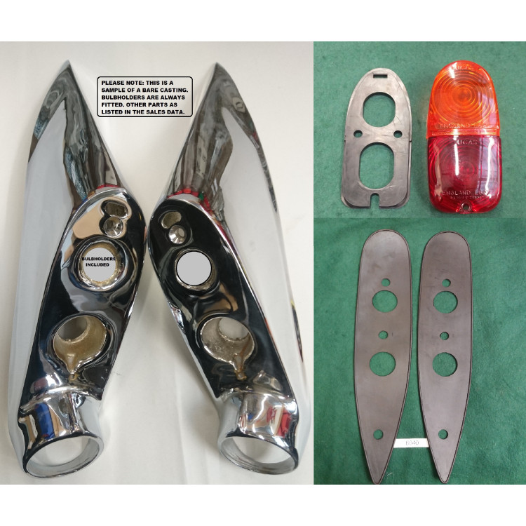 5040KIT. A complete kit of 5040 Late XK150 Chrome plated rear stop / tail Light Plinth units & 5116 Pair of Lens Assemblies with upper lens Seal, 6040 Rubber Seals to Body & 5111 Reflector Units too. Sold as a discounted, complete kit. New ZA12 castings , Chrome plated assemblies with Stop & Tail Light amber & red lenses, assembled on gasket & reflectors and seals to body for a complete job.