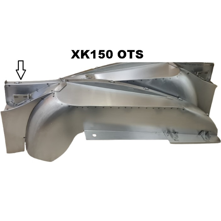 CAC5-83L. XK150 REAR INNER LEFT HAND SIDE WING PANEL (from driver position) or ( Luggage area upper side). A new quality U.K. MANUFACTURED steel panel, made to order. The inner 'Ear' section is assembled with self-tapping screws (as shown) for best final fit and then welding into place as shown.