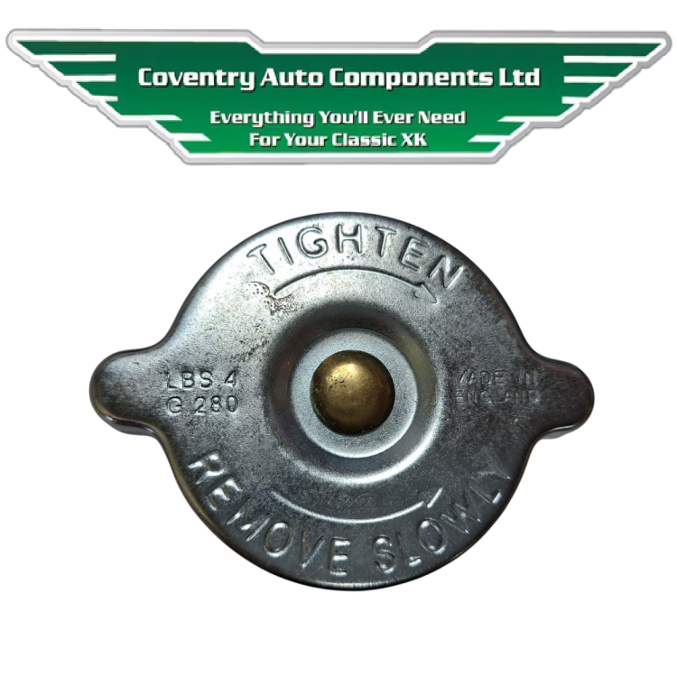 8090A x 1. Correct 60mm diameter, deep neck XK140 & XK150 Standard specification Radiator Cap, in the original, low 4lb pressure the period factory rating. For Late XK140, fluted top tank & XK150 all models. Standard O.E. 4lb Pressure.