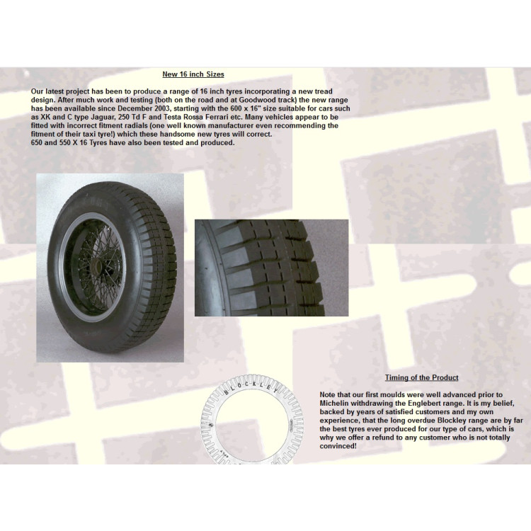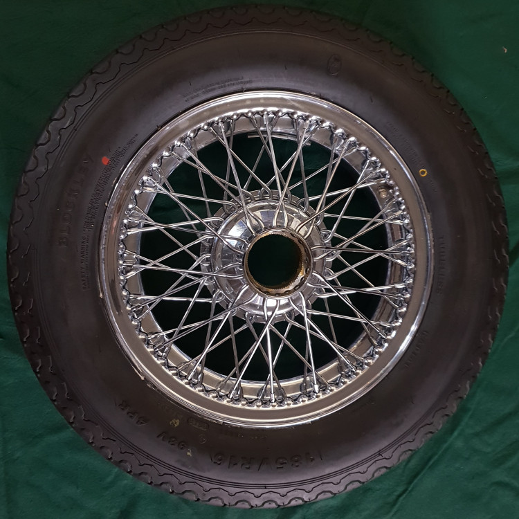 5 off 5 x 16" 60 reinforced stainless steel spokes (butted), chrome rimmed, wire wheels, to Suit XK120, XK140 or XK150. These are the standard 16" diameter XK wire wheel you see on most cars, fitted with the very popular 185VR16 Blockley brand, RADIAL DESIGN, tyres fully assembled with any necessary tubes/ bands , balanced correctly and ready to roll. Blockleys are considered one of the best tyres around for serious Classic Car owner / drivers and are marked by specialists like us to keep prices competitive. The Radial design is far more effective for handling as it allows the sidewall to flex into a bend, giving far superior handling to original 1950 crossplies, that are known for suddenly breaking traction and skidding across the road surface.