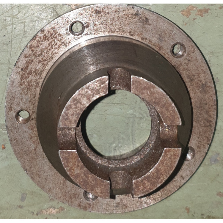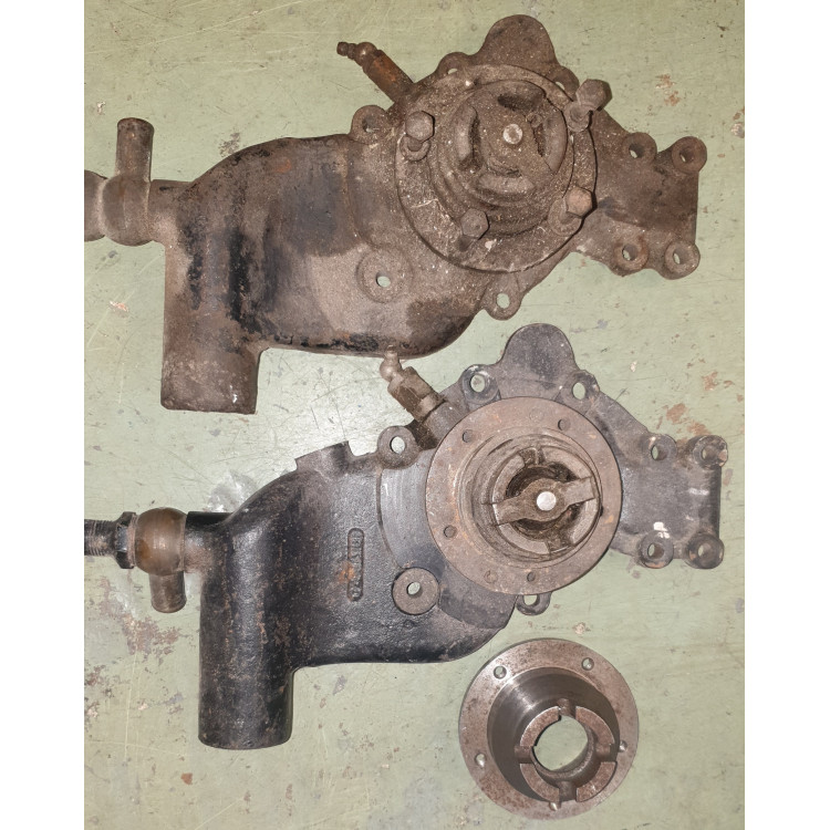 Rebuilt, RARE, original Jaguar Early XK120 C4938 waterpumps. This design features a circular ( 5-hole) design of hub with twin bearing races inside. The hub is designed for fitting of a seperate aluminium pulley and 5-blade cast ( propellor look ) fan. This is the early, original factory fitted design of  pump with bearings inside the hub itself, discernable by the open top, dog / cross bar  with securing circlip etc. Original Number C3870. Cast into the body will be C4938