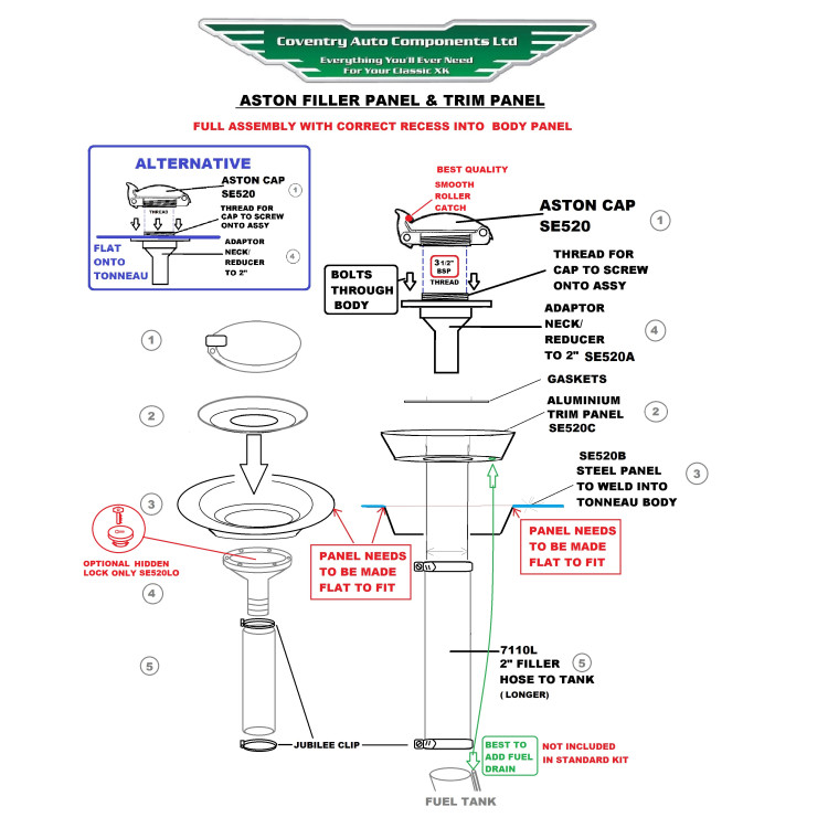 SE520A x 1. A threaded Funnel neck to fit under the body to fit the 3½ BSP Filler cap thread, reducing down to 2" to offer up to the standard XK fuel tank filler neck hose.