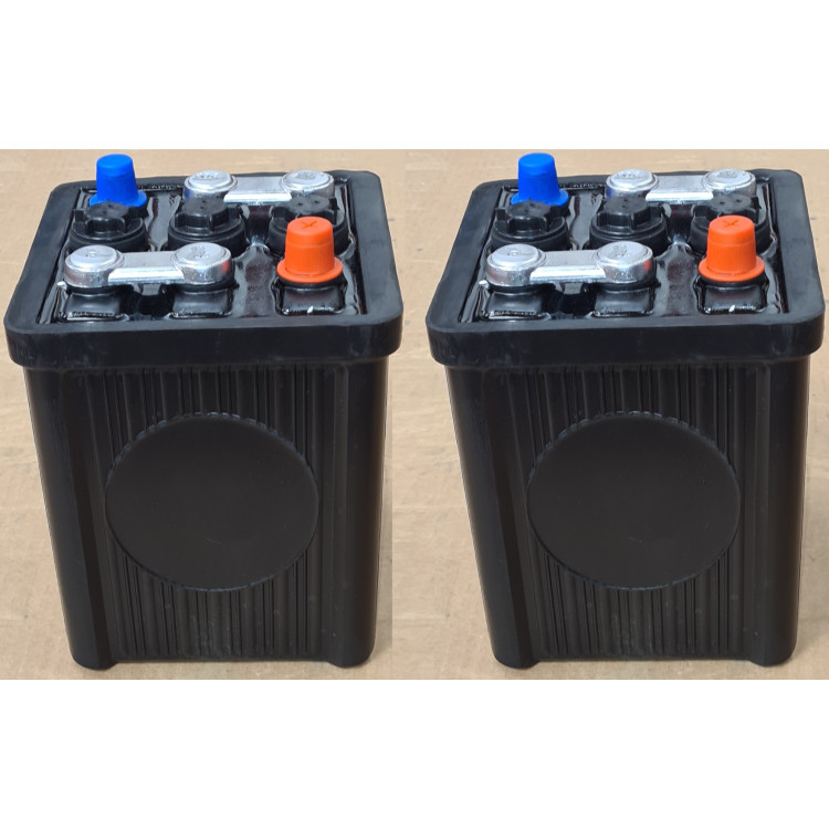5366 x 2. A pair of original style (lead jointed) top cell spec. batteries to suit all XK150 models & XK140 Fixed Head Coupe featuring 58 A/Hr rating. Black cased new Batteries in standard 6-Volt spec. To be fitted in the standard series wiring configuration under the rear of the front wings.