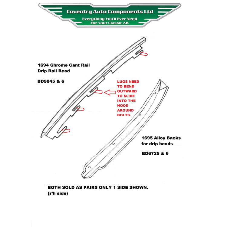 1 x 1694 Pair. XK120 & XK140 Drop Head Coupe Door Top Gutters. The special, Chrome plated outer cant-rail Capping or Drip Bead that slides into the hood to create a gutter. SOLD AS A PAIR. Original Number BD6721 & BD6722.