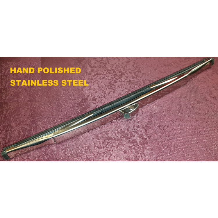 5170 x 1 pair. Quality, Polished Stainless Steel , Sprung Wiper Blade for the XK150 curved windscreen. NOTE: Not the commonly available blade, but our own special order *Hand Polished*, stainless steel, Made in England version for a high quality look. This fitting design is known as Lucas 'wrist' or 'spoon' type fitting which is a curved ended wiper arm with a locking hook into a square locator on the blade unit.