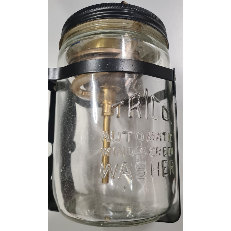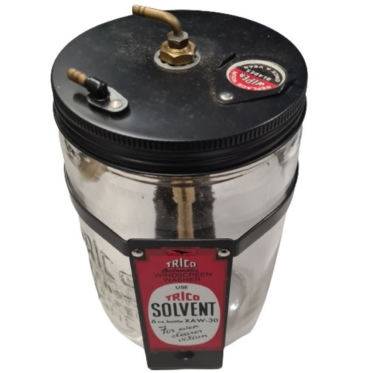9710x1. New reproduction XK150 Screen Washer Jar, Pump & Bracket Assembly. These last three bottles we have in stock do still have the Trico emblem cast into the glass.