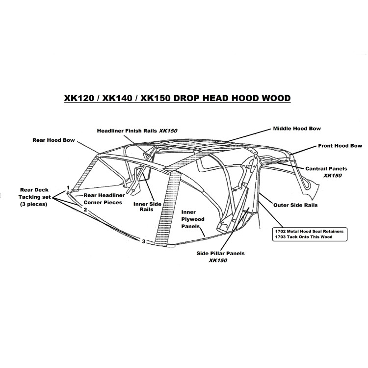 9859W x 1. XK140 Drop Head Coupe Metal Hood Frame with Woodset. The Front wood is fitted to this frame then trimmed to fit the screen rail. The woods give the frame its basic shape before the 8 layers of wadding/ padding and outer mohair is then built onto it. The Drop Head Coupe also has an inner lining (Roadsters do not) trimmed to the wood to hide the framework.