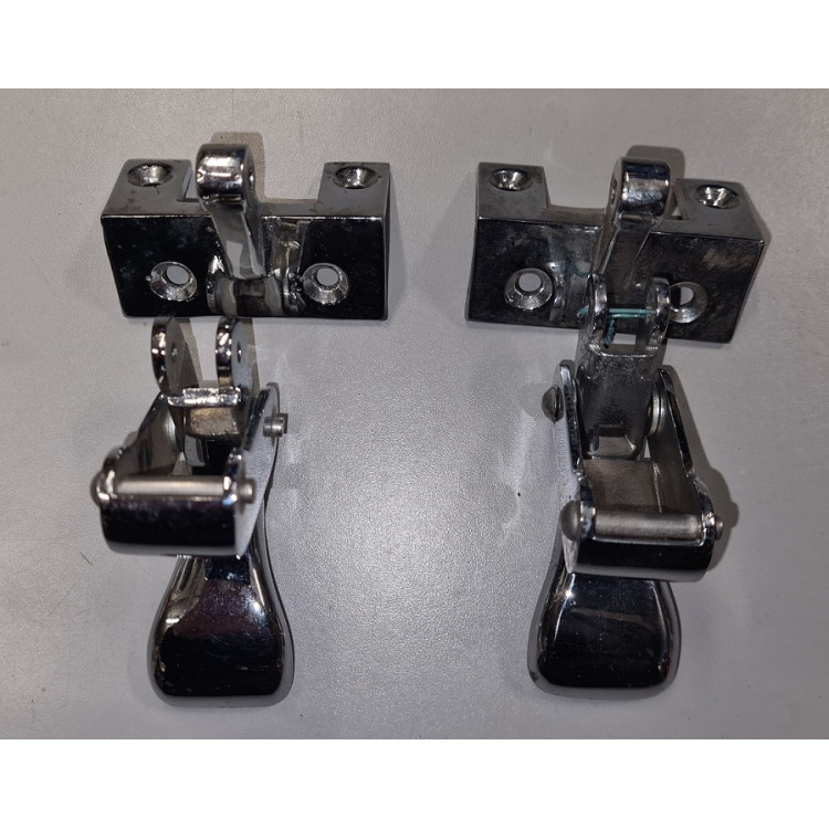 2194PLP x 1pair. A VERY NICE pair of RECHROMED XK150 Later spec. Drop Head Coupe, over centre hood catches, which hook onto the canopy rail hook on windscreen surround. Each needs simply riveting together at one point, to make you a very nice saving.