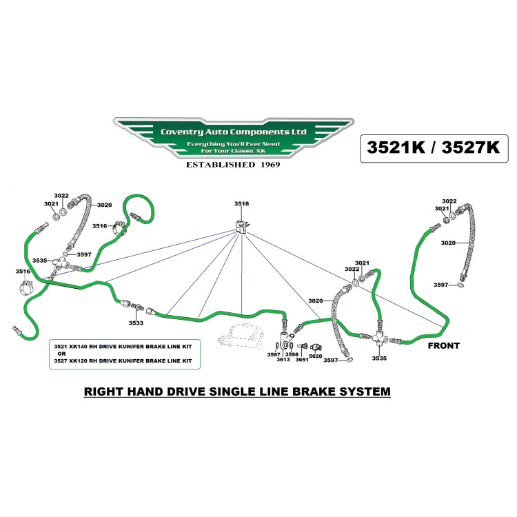 3527 x 1 kit. Our Top Quality XK120 Brake Pipe Kit in Kunifer for (early spec) Right Hand Drive Vehicles with the Single Master Cylinder (3120) Brake system.