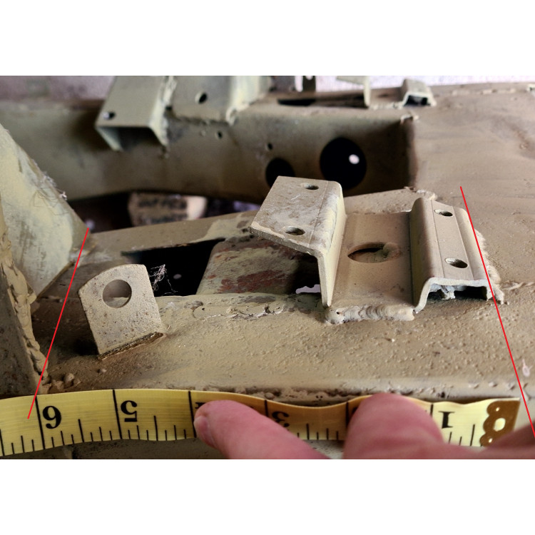 These steel brackets require welding directly to the XK120 chassis (originally had a 5ft long steering box ) over the radiator mount area to replicate the XK140/150 positioning. A reference picture of an XK150 chassis rack mount bracket is shown with a dimension.