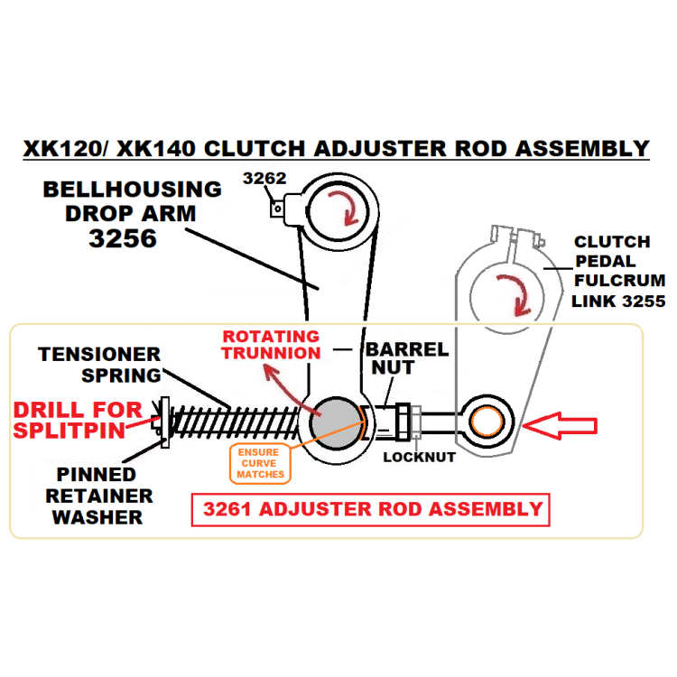 3261 x 1. Our own complete adjuster assembly kit which is beautifully made for XK120 & XK140 manual Clutch Pedal lever adjustment (3594, 3595, 3263) with spring, trunnion , brass barrel-nut and steel locknut. The long shaft should be drilled and pinned to be correct. We supply these to the best Jaguar trade outlets across the World so carry good stocks of these. Original Ref. Number C2423, C2482, C5180, C4165