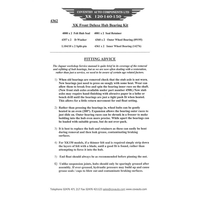 4000K x 1 kit. Suits XK120 & XK140 & XK150 on both sides kit. A Front Wheel Bearing Deluxe Fitting Kit which also includes: 2 x Felt Seal and Retainer rings, 2 x D-washers with the securing split-pins for the castle nut.