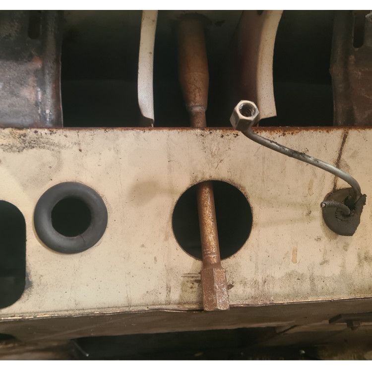 1 x 1014 Centre Pillar Extension Nut. The long reach, securing nut, for XK120 & XK140 Roadster's centre screen pillar. This unique, but essential, part for under the bulkhead reaches up to the very awkward place where the pillar bolts through the scuttle, secured from behind the dashboard as shown. Original Jaguar Ref No: BD4696.