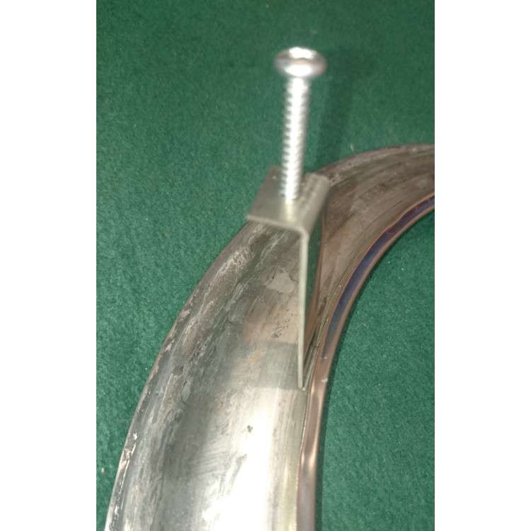 NOTE : Remove wheel from vehicle to fit these rims easily. Clips slide under the returned inner lip of the rimbellisher and then passes through each of the wheel slots in the inner section of wheel. The clip is then secured with self-tapping screws against back of the steel wheel until tightly clamped in place.