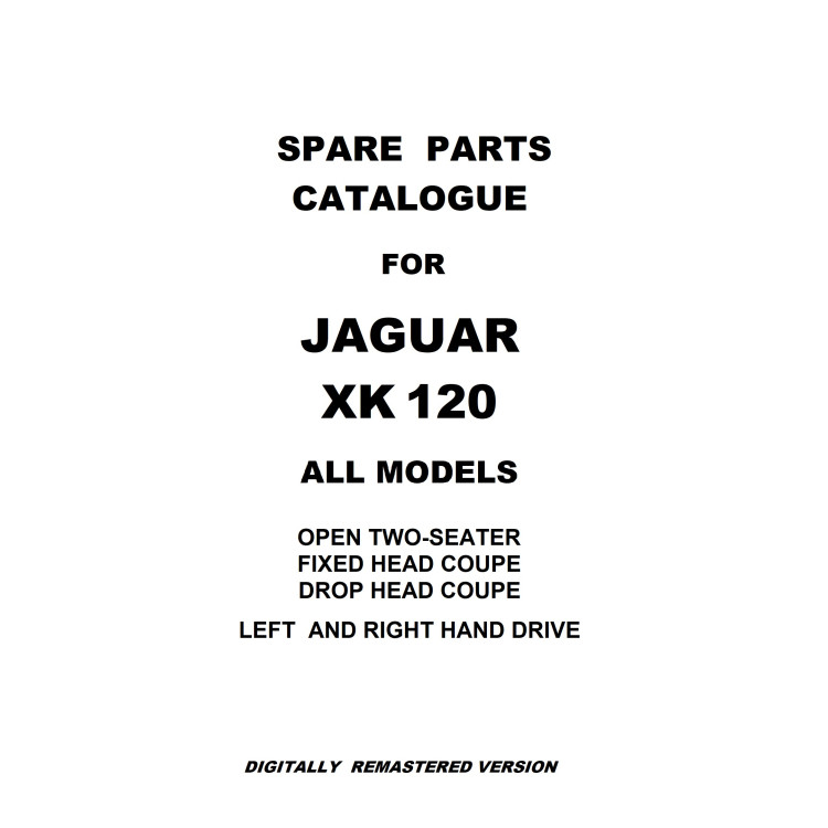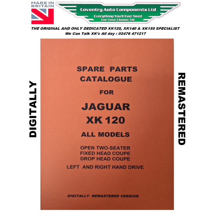9030 x 1. This book is our own digitally, (but sympathetically) remastered quality reprint of the Original Jaguar XK120 Spare Parts Catalogue. A detailed parts book that every owner should have, listing every part fitted with quantities, featuring the original Jaguar supplied (detailed) diagrams and covers all variations of the XK120 (3 Original seperate books, provided as 1 compendium).