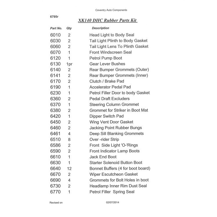 6795 x 1. XK140 Drop Head Coupe Superior Rubber Parts Kit. A comprehensive kit covering screen seal, light seals to body, neoprene vent seals, petrol filler seal (ring is correct cork material), gearstick bobbins, buffers, wiper seals, solenoid button, cockpit trims and pedal seals & pads etc as listed.The reason why we don’t buy the stuff everyone else knocks out? We know from dealing with the hobby restorer and the trade that many rubber kits on the market are incorrect. We also of course are just on the end of the phone or email if you need any further advice during the day.