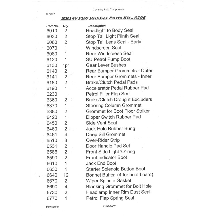 6796 x 1. XK140 FHC Rubber Parts Kit. A comprehensive kit covering screen seals, light seals to body, neoprene vent seals, petrol filler seal (ring is correct cork material), gearstick bobbins, buffers, wiper seals, solenoid button, cockpit trims and pedal seals & pads etc as listed.The reason why we don’t buy the stuff everyone else knocks out? We know from dealing with the hobby restorer and the trade that many rubber kits on the market are incorrect. We also of course are just on the end of the phone or email if you need any further advice during the day.NOTE: Please be careful with your after purchase storage of seals before fitting as they can distort if left twisted or with something resting on them. Remember, you only want them to form to the shape of your vehicle.